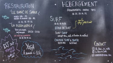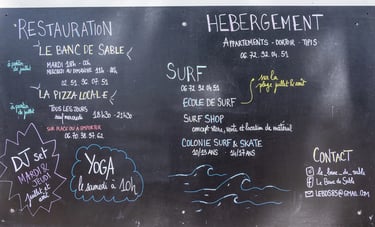 Sur place, tout est conçu pour vivre pleinement le lieu : espaces de vie chaleureux et accueillants, une restauration saisonnière de qualité provenant de producteurs locaux ou des partenaires traiteurs ainsi qu'un choix d'activités (surf, vélo, yoga, ateliers culinaire ...) tout au long de l'année. Le Banc de Sable offre un cadre idéal pour se déconnecter du quotidien, se retrouver entre amis ou en famille et profiter de la beauté naturelle exceptionnelle du cadre de la côte Vendéenne.